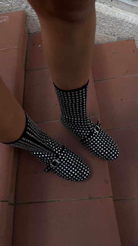 Crystal Flat Studded Boots Women's Fashion Belt Buckle Round Toe Women's Leather