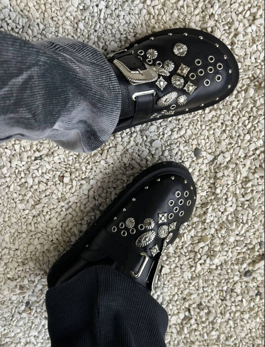 Vintage Half-Sandal Mules with Thick Sole, Rivets, and Flat Heel