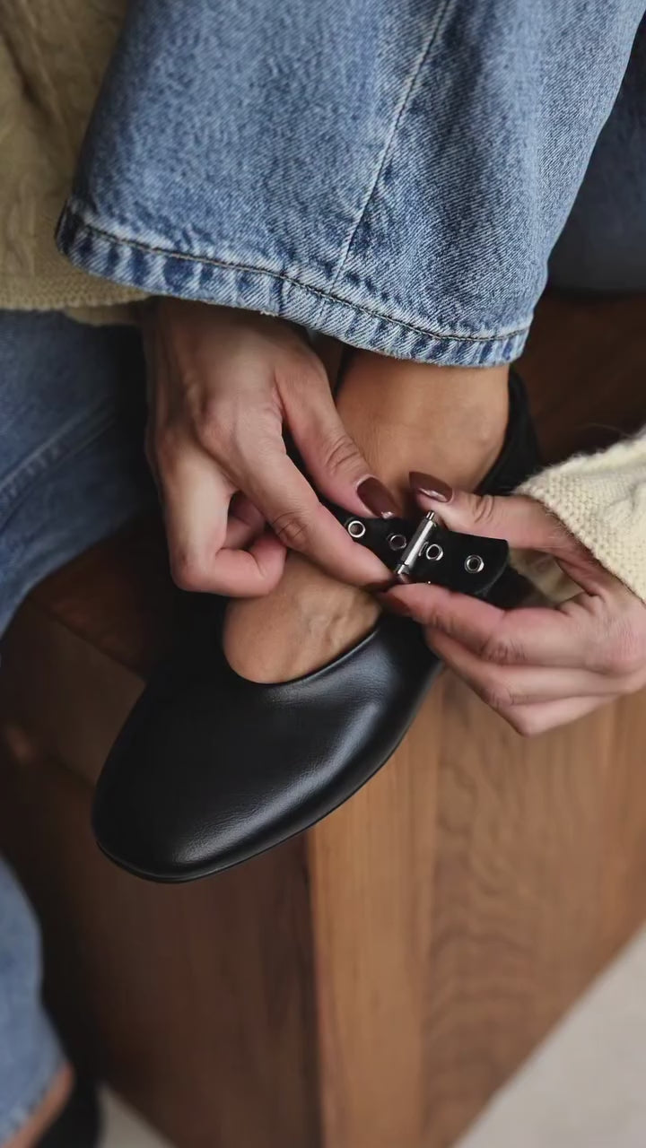 Elevate your everyday style with these sophisticated black ballet flats. Crafted from premium smooth leather, these timeless shoes feature a distinctive buckle strap across the vamp add a modern edge to the classic ballerina silhouette. black leather construction for durability and elegance