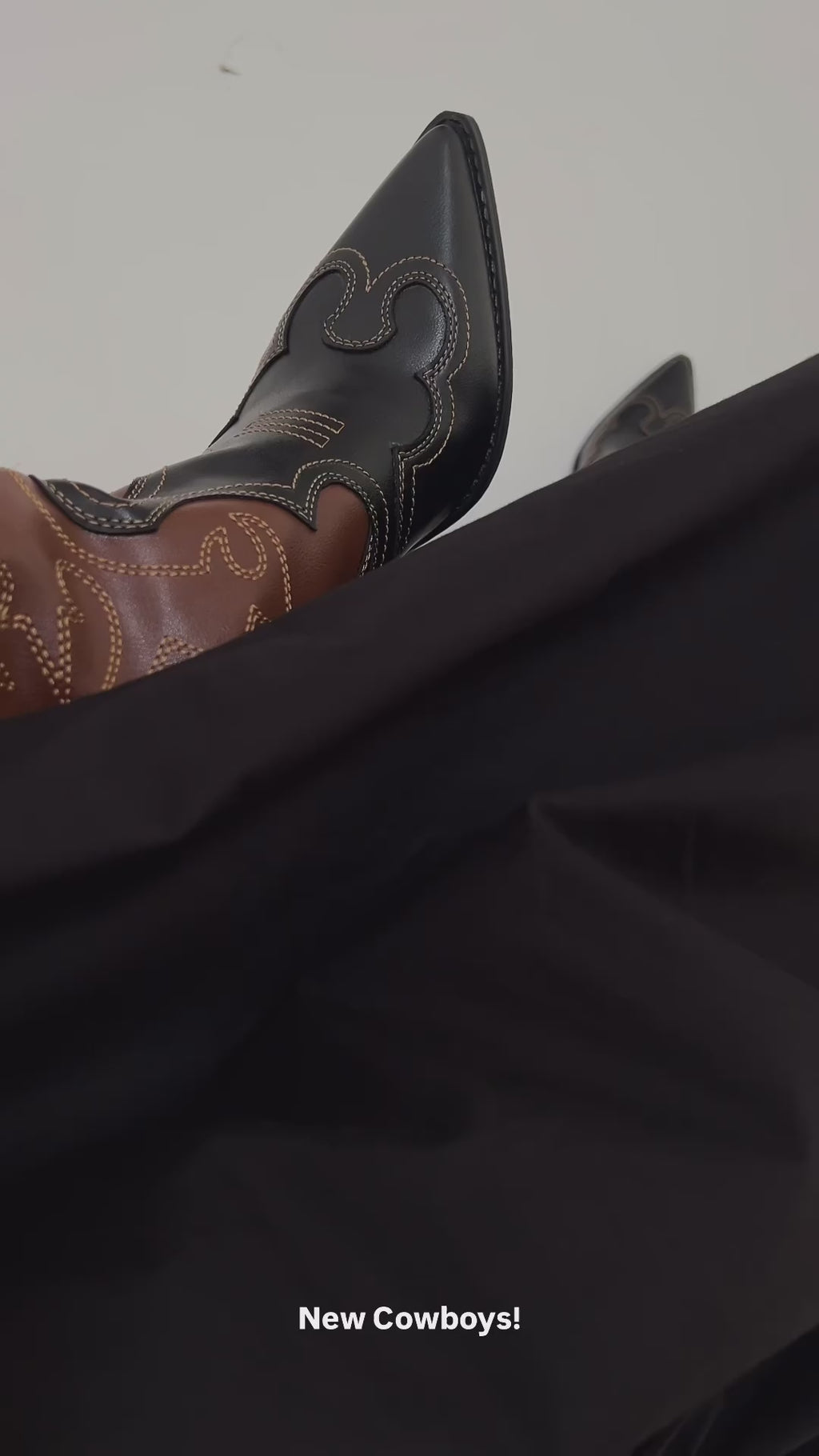 Faux leather cowboy boots with chunky heels and pieced embroidery.